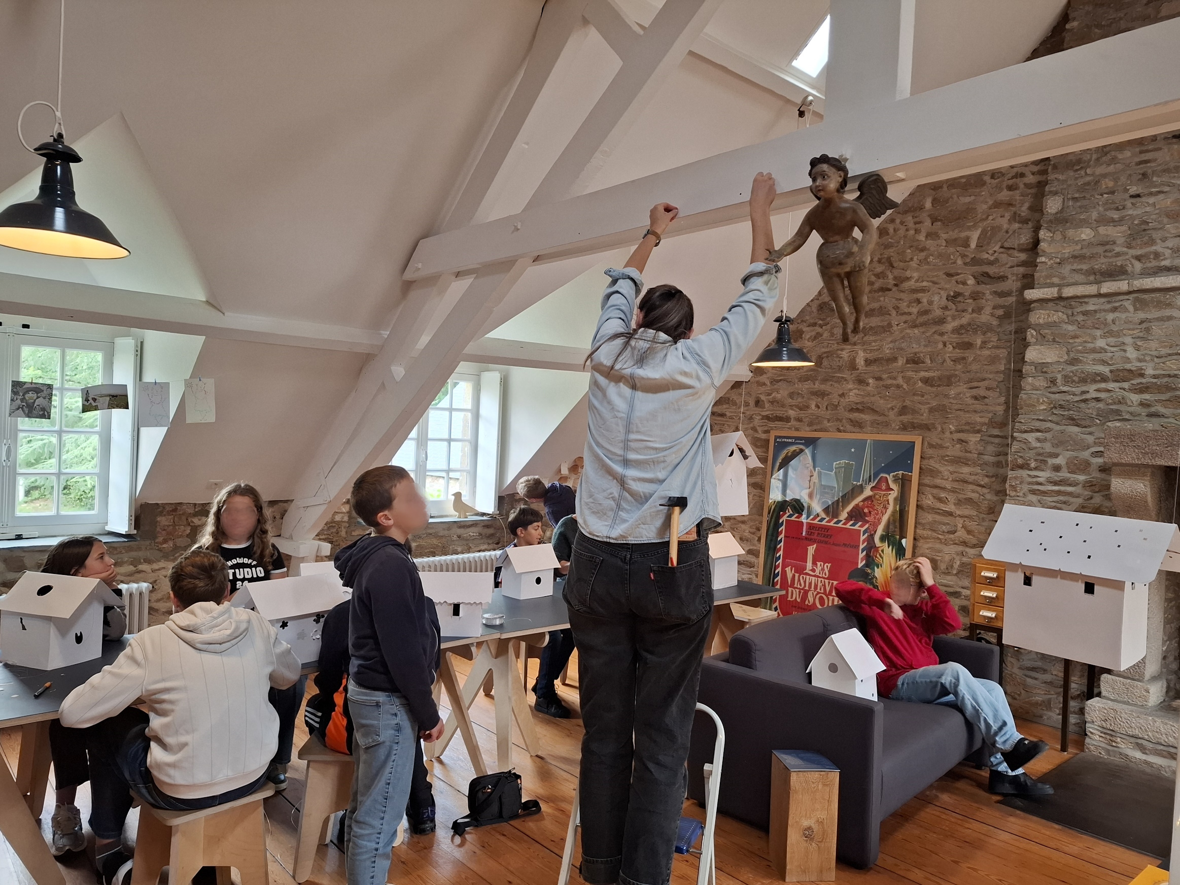 Retour à la maison Jacques Prévert pour la dernière étape : le montage de l’exposition. L’emplacement de chaque maison dans le lieu d’exposition a été rigoureusement choisi par les élèves. Certaines sont posées sur la cheminée ou une table. D’autres sont suspendues aux poutres. Enfin, chaque élève a rédigé un cartel présentant sa maison.